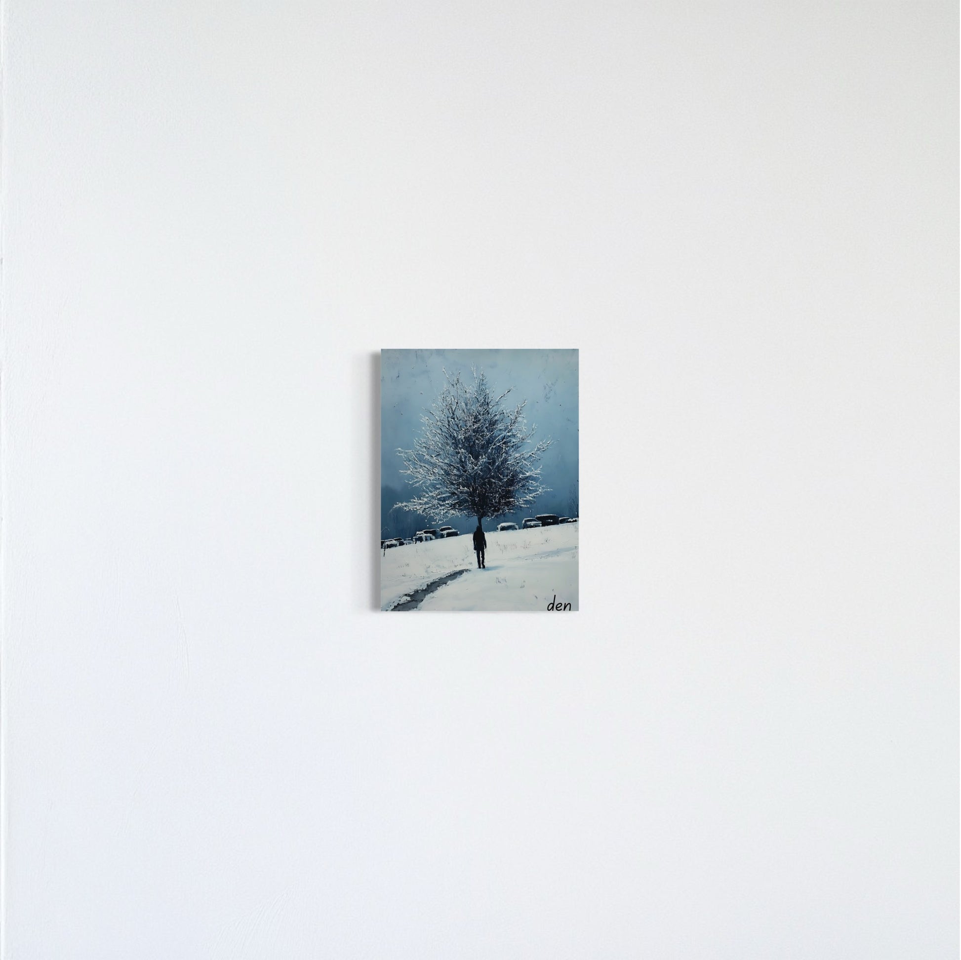 This contemplative oil painting depicts a solitary figure standing beneath a frost covered tree in a quiet winter landscape. Muted blues, soft whites, and subtle textures create a still, introspective mood that speaks to solitude, reflection, and the quiet weight of silence found in winter.